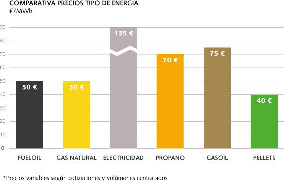 El pellet resulta mucho más económico que los combustibles fósiles tradicionales, ya que es un 55% más barato que el gasóleo. Además, el precio posee una estabilidad que no tienen los combustibles fósiles, cuyo precio fluctúa con frecuencia, ya que queda referenciado a la cotización del dólar y es independiente del precio del petróleo. Por tanto, el comprador de pellet queda libre de la voracidad de las grandes compañías energéticas.